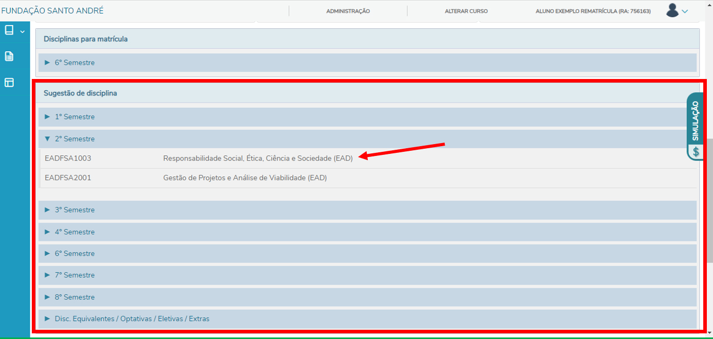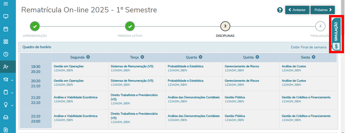 Após inclusão de disciplinas, o valor das parcelas será atualizado no menu SIMULAÇÃO.